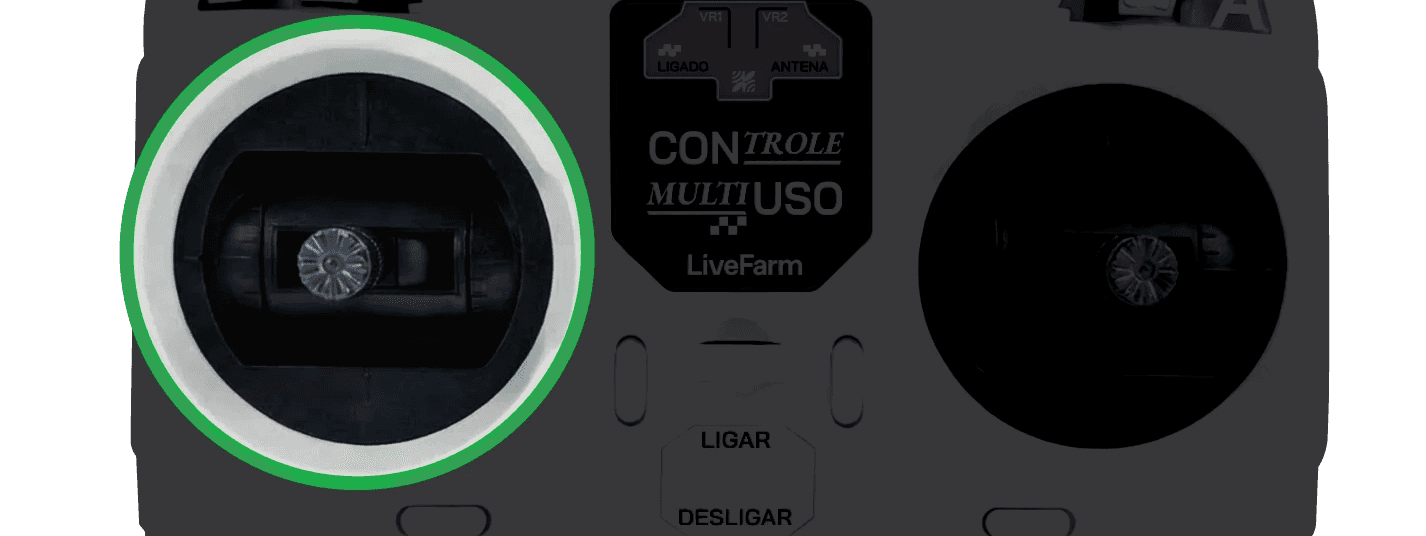O joystick da esquerda controla a altura da plataforma de corte. Para cima, a plataforma sobe. Para baixo, ela desce. Na parte de cima desse mesmo lado, existe um direcional menor só para ajustes finos de altura quando você precisa posicionar a plataforma com mais exatidão para o tipo de vegetação ou o desnível do solo.