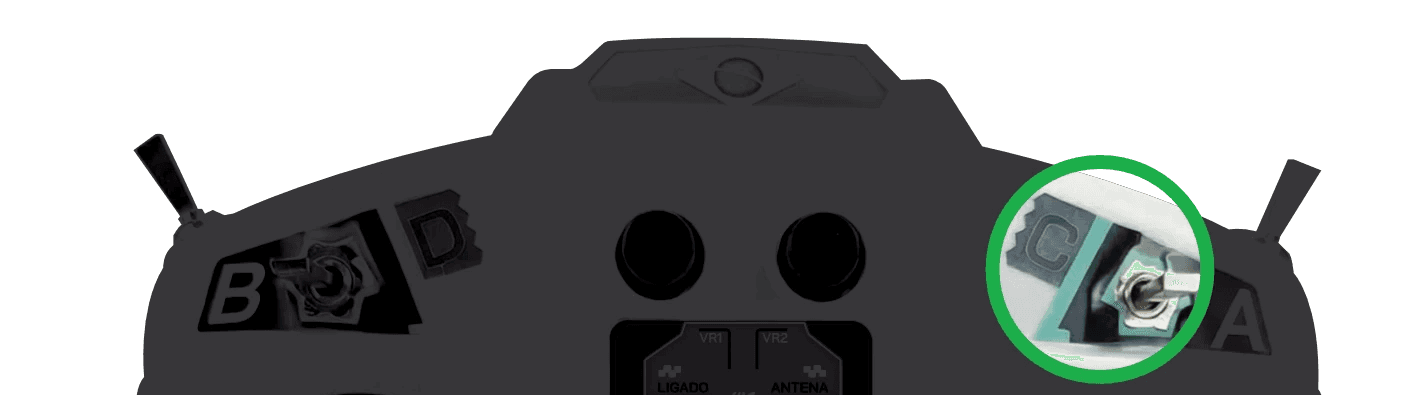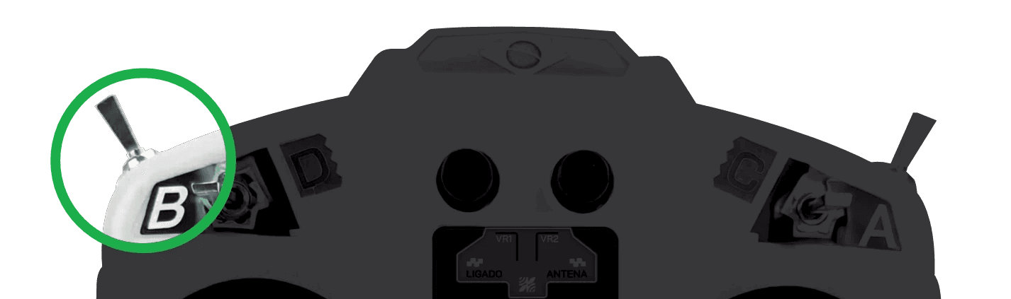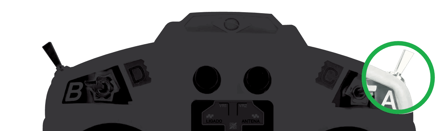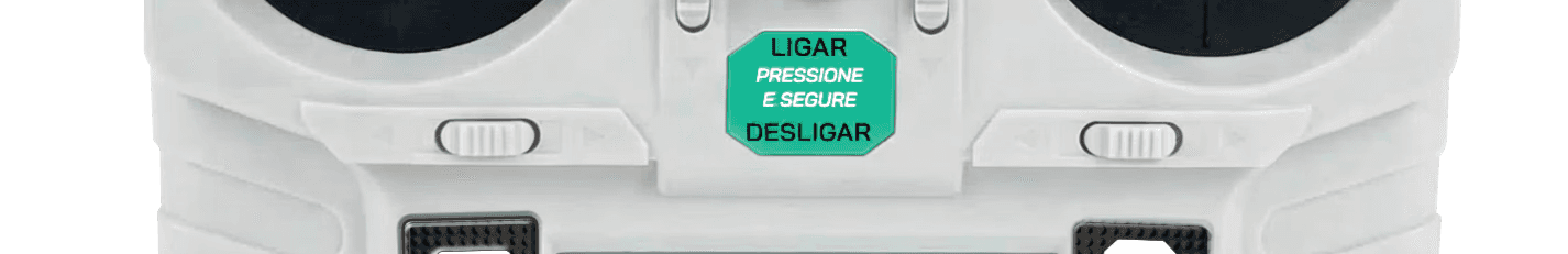 Botão A — fica na face da frente do controle. Liga e desliga as lâminas. Enquanto o Botão A não for acionado, a máquina anda sem cortar. Isso serve para reposicionar a roçadeira antes de começar o trabalho.