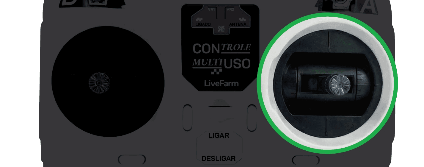 O joystick da direita é o que movimenta a máquina. Frente, trás, curva para a direita, curva para a esquerda. Toda a navegação da roçadeira no terreno passa por ele.