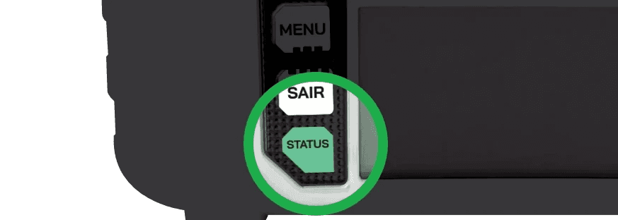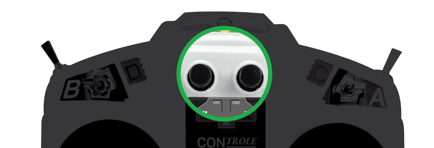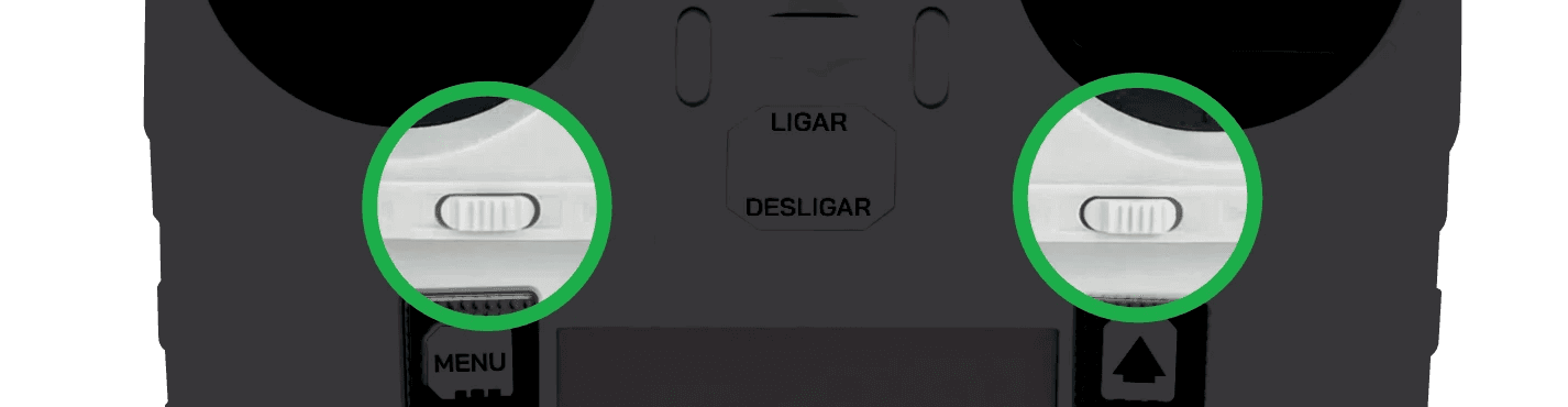 No centro do controle ficam dois mostradores, parecidos com botões de volume, que indicam a qualidade do sinal entre o controle e a máquina. As duas antenas devem ficar totalmente desobstruídas durante o uso. A força do sinal depende da distância, do relevo entre você e a roçadeira, e de obstáculos no caminho, árvores, construções, elevações de terreno.