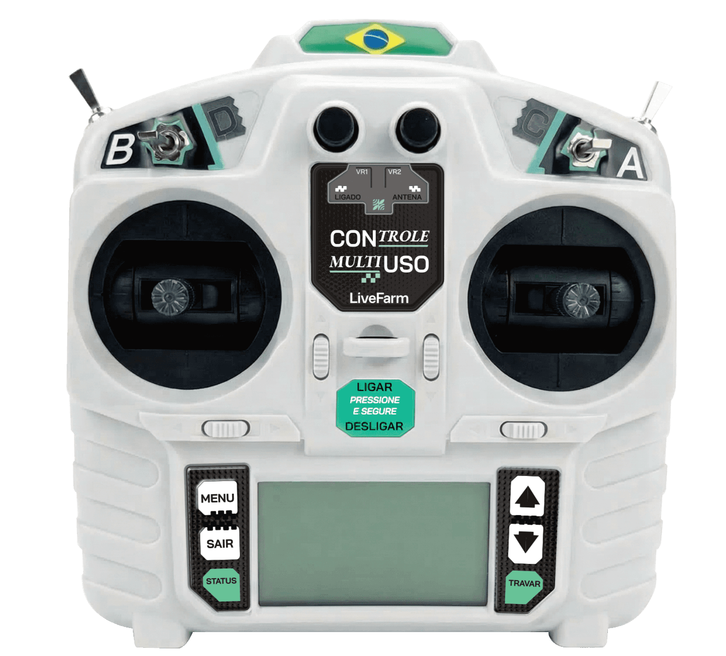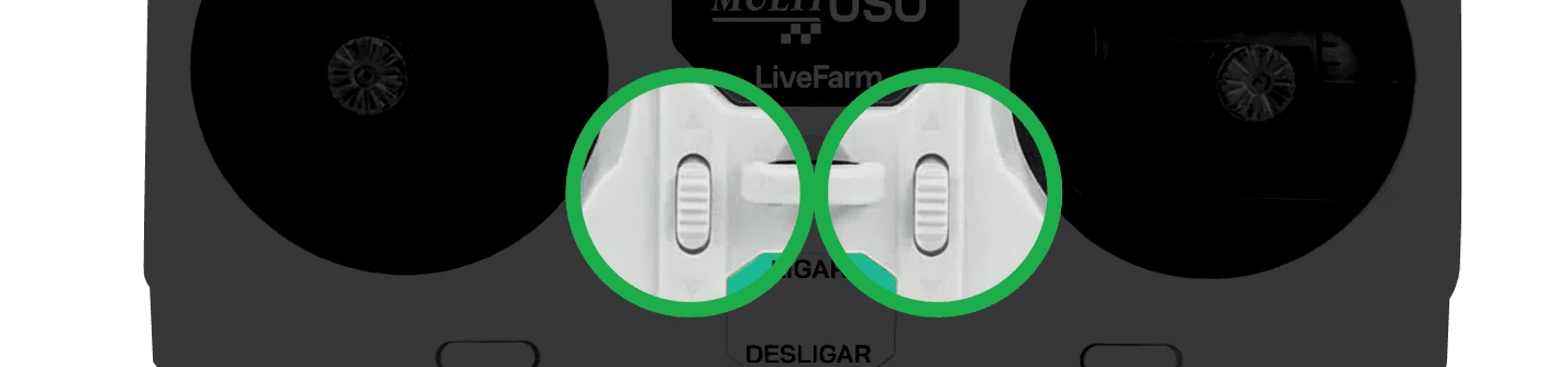 Este é o controle remoto da roçadeira Live Farm. Com ele, você comanda a máquina a até 200 metros de distância, sem perda de sinal. O controle tem duas antenas, um painel digital no centro, e dois joysticks, um de cada lado, que reúnem todas as funções: movimentar a máquina, acionar o corte e regular a altura da plataforma.